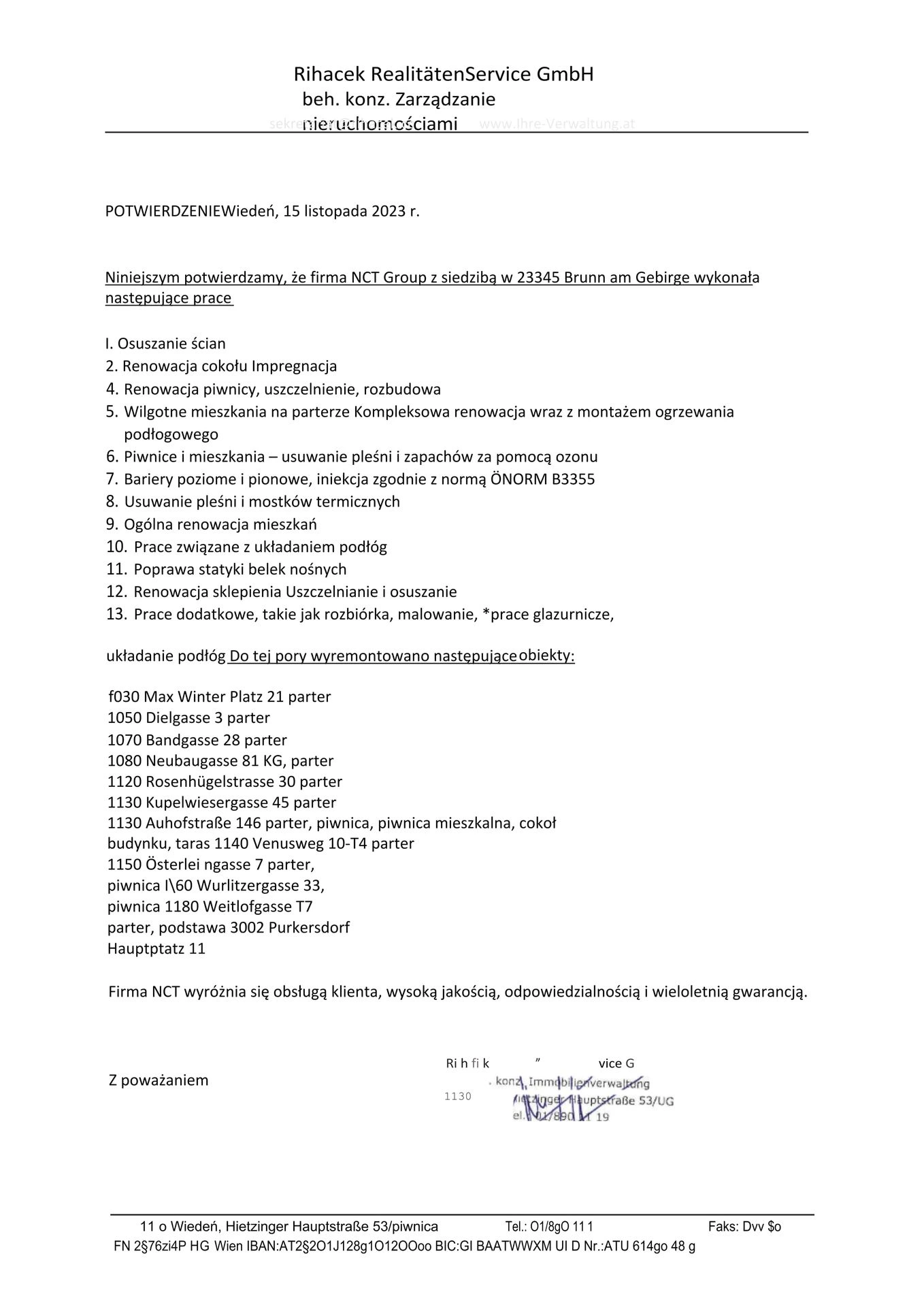 List referencyjny Rihacek Zarządzanie nieruchomościami