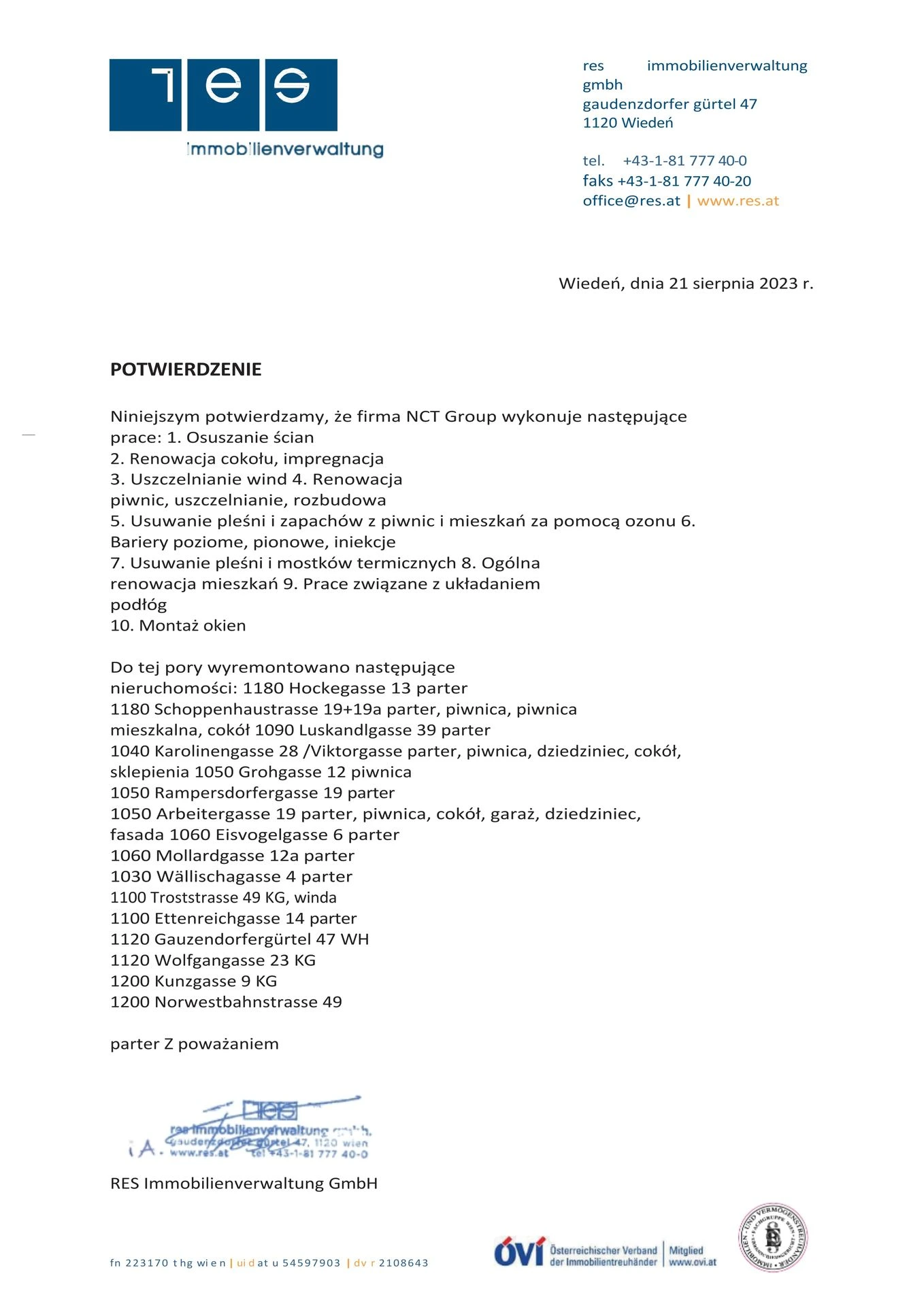 List referencyjny RES Zarządzanie nieruchomościami